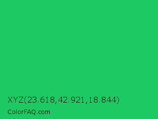 XYZ 23.618,42.921,18.844 Color is a normal green color and the nearest color is Malachite #0bda51. Hex code #1cc963 and RGB value is rgb(28,201,99). In RGB color space, this color is composed of 11% red, 79% green, 39% blue, In CMYK color space, this color is composed of 86% cyan, 0% magenta, 51% yellow , 21% black , In HSL color space, this color has a hue angle of 145° , 76% saturation and 45% lightness.