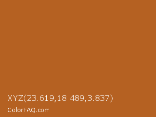 XYZ 23.619,18.489,3.837 Color is a normal orange color and the nearest color is Light Brown #b5651d. Hex code #b56122 and RGB value is rgb(181,97,34). In RGB color space, this color is composed of 71% red, 38% green, 13% blue, In CMYK color space, this color is composed of 0% cyan, 46% magenta, 81% yellow , 29% black , In HSL color space, this color has a hue angle of 26° , 68% saturation and 42% lightness.