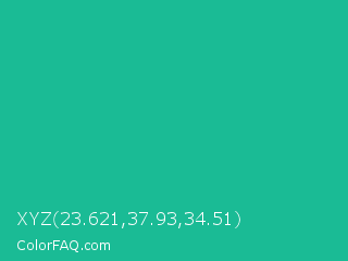 XYZ 23.621,37.93,34.51 Color is a normal cyan color and the nearest color is Mountain Meadow Crayola #1ab385. Hex code #1abb95 and RGB value is rgb(26,187,149). In RGB color space, this color is composed of 10% red, 73% green, 58% blue, In CMYK color space, this color is composed of 86% cyan, 0% magenta, 20% yellow , 27% black , In HSL color space, this color has a hue angle of 166° , 76% saturation and 42% lightness.