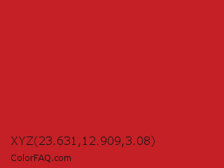 XYZ 23.631,12.909,3.08 Color is a normal red color and the nearest color is Fire Engine Red #ce2029. Hex code #c42026 and RGB value is rgb(196,32,38). In RGB color space, this color is composed of 77% red, 13% green, 15% blue, In CMYK color space, this color is composed of 0% cyan, 84% magenta, 81% yellow , 23% black , In HSL color space, this color has a hue angle of 358° , 72% saturation and 45% lightness.
