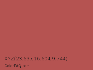 XYZ 23.635,16.604,9.744 Color is a normal red color and the nearest color is Giants Club #b05c52. Hex code #b55351 and RGB value is rgb(181,83,81). In RGB color space, this color is composed of 71% red, 33% green, 32% blue, In CMYK color space, this color is composed of 0% cyan, 54% magenta, 55% yellow , 29% black , In HSL color space, this color has a hue angle of 1° , 40% saturation and 51% lightness.