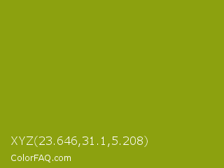 XYZ 23.646,31.1,5.208 Color is a normal yellow color and the nearest color is Apple Green #8db600. Hex code #8ca10f and RGB value is rgb(140,161,15). In RGB color space, this color is composed of 55% red, 63% green, 6% blue, In CMYK color space, this color is composed of 13% cyan, 0% magenta, 91% yellow , 37% black , In HSL color space, this color has a hue angle of 69° , 83% saturation and 35% lightness.