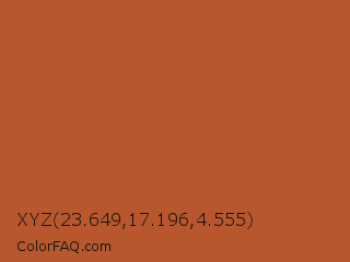 XYZ 23.649,17.196,4.555 Color is a normal orange color and the nearest color is Tuscany #bd5e2e. Hex code #b8572d and RGB value is rgb(184,87,45). In RGB color space, this color is composed of 72% red, 34% green, 18% blue, In CMYK color space, this color is composed of 0% cyan, 53% magenta, 76% yellow , 28% black , In HSL color space, this color has a hue angle of 18° , 61% saturation and 45% lightness.