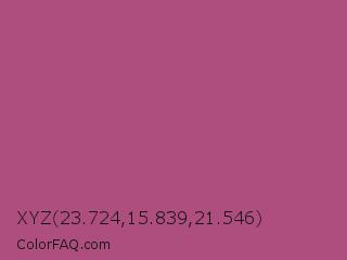 XYZ 23.724,15.839,21.546 Color is a normal rose color and the nearest color is Mystic Maroon #ad4379. Hex code #ad4e7e and RGB value is rgb(173,78,126). In RGB color space, this color is composed of 68% red, 31% green, 49% blue, In CMYK color space, this color is composed of 0% cyan, 55% magenta, 27% yellow , 32% black , In HSL color space, this color has a hue angle of 330° , 38% saturation and 49% lightness.