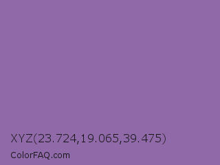 XYZ 23.724,19.065,39.475 Color is a normal purple color and the nearest color is Wisteria #9771b5. Hex code #906aa8 and RGB value is rgb(144,106,168). In RGB color space, this color is composed of 56% red, 42% green, 66% blue, In CMYK color space, this color is composed of 14% cyan, 37% magenta, 0% yellow , 34% black , In HSL color space, this color has a hue angle of 277° , 26% saturation and 54% lightness.