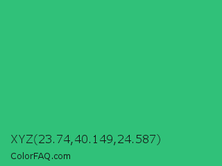 XYZ 23.74,40.149,24.587 Color is a normal green color and the nearest color is Medium Sea Green #3cb371. Hex code #30c179 and RGB value is rgb(48,193,121). In RGB color space, this color is composed of 19% red, 76% green, 47% blue, In CMYK color space, this color is composed of 75% cyan, 0% magenta, 37% yellow , 24% black , In HSL color space, this color has a hue angle of 150° , 60% saturation and 47% lightness.