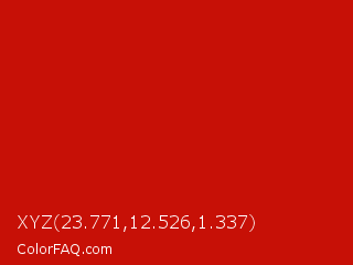 XYZ 23.771,12.526,1.337 Color is a normal red color and the nearest color is Milano Red #b81104. Hex code #c71006 and RGB value is rgb(199,16,6). In RGB color space, this color is composed of 78% red, 6% green, 2% blue, In CMYK color space, this color is composed of 0% cyan, 92% magenta, 97% yellow , 22% black , In HSL color space, this color has a hue angle of 3° , 94% saturation and 40% lightness.
