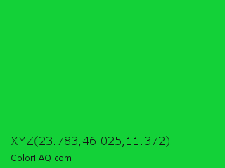 XYZ 23.783,46.025,11.372 Color is a normal green color and the nearest color is Vivid Malachite #00cc33. Hex code #13d138 and RGB value is rgb(19,209,56). In RGB color space, this color is composed of 7% red, 82% green, 22% blue, In CMYK color space, this color is composed of 91% cyan, 0% magenta, 73% yellow , 18% black , In HSL color space, this color has a hue angle of 132° , 83% saturation and 45% lightness.