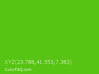 XYZ 23.788,41.553,7.383 Color is a normal green color and the nearest color is Kelly Green #4cbb17. Hex code #57c413 and RGB value is rgb(87,196,19). In RGB color space, this color is composed of 34% red, 77% green, 7% blue, In CMYK color space, this color is composed of 56% cyan, 0% magenta, 90% yellow , 23% black , In HSL color space, this color has a hue angle of 97° , 82% saturation and 42% lightness.