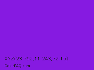XYZ 23.792,11.243,72.15 Color is a normal purple color and the nearest color is Blue Violet #8a2be2. Hex code #861ae1 and RGB value is rgb(134,26,225). In RGB color space, this color is composed of 53% red, 10% green, 88% blue, In CMYK color space, this color is composed of 40% cyan, 88% magenta, 0% yellow , 12% black , In HSL color space, this color has a hue angle of 273° , 79% saturation and 49% lightness.