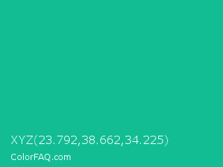XYZ 23.792,38.662,34.225 Color is a normal cyan color and the nearest color is Mountain Meadow Crayola #1ab385. Hex code #12bd94 and RGB value is rgb(18,189,148). In RGB color space, this color is composed of 7% red, 74% green, 58% blue, In CMYK color space, this color is composed of 90% cyan, 0% magenta, 22% yellow , 26% black , In HSL color space, this color has a hue angle of 166° , 83% saturation and 41% lightness.