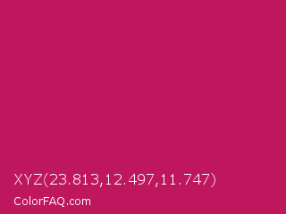 XYZ 23.813,12.497,11.747 Color is a normal rose color and the nearest color is Rose Red #c21e56. Hex code #bf175e and RGB value is rgb(191,23,94). In RGB color space, this color is composed of 75% red, 9% green, 37% blue, In CMYK color space, this color is composed of 0% cyan, 88% magenta, 51% yellow , 25% black , In HSL color space, this color has a hue angle of 335° , 79% saturation and 42% lightness.