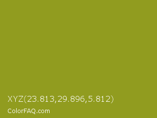 XYZ 23.813,29.896,5.812 Color is a normal yellow color and the nearest color is Citron #9fa91f. Hex code #919c1f and RGB value is rgb(145,156,31). In RGB color space, this color is composed of 57% red, 61% green, 12% blue, In CMYK color space, this color is composed of 7% cyan, 0% magenta, 80% yellow , 39% black , In HSL color space, this color has a hue angle of 65° , 67% saturation and 37% lightness.