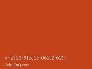 XYZ 23.815,15.062,2.629 Color is a normal red color and the nearest color is Dark Pastel Red #c23b22. Hex code #c0411a and RGB value is rgb(192,65,26). In RGB color space, this color is composed of 75% red, 25% green, 10% blue, In CMYK color space, this color is composed of 0% cyan, 66% magenta, 86% yellow , 25% black , In HSL color space, this color has a hue angle of 14° , 76% saturation and 43% lightness.