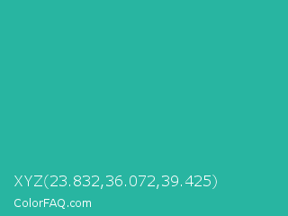 XYZ 23.832,36.072,39.425 Color is a normal cyan color and the nearest color is Light Sea Green #20b2aa. Hex code #28b5a1 and RGB value is rgb(40,181,161). In RGB color space, this color is composed of 16% red, 71% green, 63% blue, In CMYK color space, this color is composed of 78% cyan, 0% magenta, 11% yellow , 29% black , In HSL color space, this color has a hue angle of 171° , 64% saturation and 43% lightness.