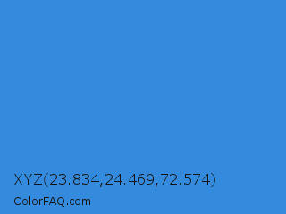 XYZ 23.834,24.469,72.574 Color is a normal blue color and the nearest color is Bleu De France #318ce7. Hex code #348bde and RGB value is rgb(52,139,222). In RGB color space, this color is composed of 20% red, 55% green, 87% blue, In CMYK color space, this color is composed of 77% cyan, 37% magenta, 0% yellow , 13% black , In HSL color space, this color has a hue angle of 209° , 72% saturation and 54% lightness.