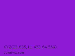 XYZ 23.835,11.433,64.569 Color is a normal purple color and the nearest color is Blue Violet #8a2be2. Hex code #8f1ad6 and RGB value is rgb(143,26,214). In RGB color space, this color is composed of 56% red, 10% green, 84% blue, In CMYK color space, this color is composed of 33% cyan, 88% magenta, 0% yellow , 16% black , In HSL color space, this color has a hue angle of 277° , 78% saturation and 47% lightness.