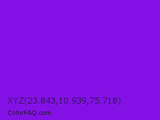 XYZ 23.843,10.939,75.718 Color is a normal purple color and the nearest color is French Violet #8806ce. Hex code #8311e6 and RGB value is rgb(131,17,230). In RGB color space, this color is composed of 51% red, 7% green, 90% blue, In CMYK color space, this color is composed of 43% cyan, 93% magenta, 0% yellow , 10% black , In HSL color space, this color has a hue angle of 272° , 86% saturation and 48% lightness.