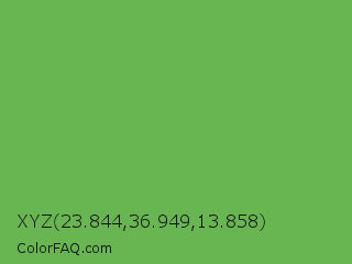 XYZ 23.844,36.949,13.858 Color is a normal green color and the nearest color is Bud Green #7bb661. Hex code #67b652 and RGB value is rgb(103,182,82). In RGB color space, this color is composed of 40% red, 71% green, 32% blue, In CMYK color space, this color is composed of 43% cyan, 0% magenta, 55% yellow , 29% black , In HSL color space, this color has a hue angle of 107° , 41% saturation and 52% lightness.