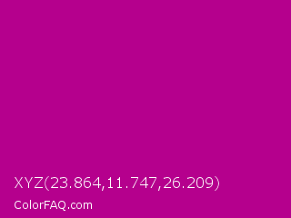XYZ 23.864,11.747,26.209 Color is a normal magenta color and the nearest color is Red Violet #c71585. Hex code #b5008d and RGB value is rgb(181,0,141). In RGB color space, this color is composed of 71% red, 0% green, 55% blue, In CMYK color space, this color is composed of 0% cyan, 100% magenta, 22% yellow , 29% black , In HSL color space, this color has a hue angle of 313° , 100% saturation and 35% lightness.