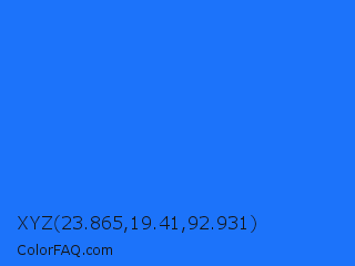 XYZ 23.865,19.41,92.931 Color is a normal blue color and the nearest color is Blue Crayola #1f75fe. Hex code #1c73fa and RGB value is rgb(28,115,250). In RGB color space, this color is composed of 11% red, 45% green, 98% blue, In CMYK color space, this color is composed of 89% cyan, 54% magenta, 0% yellow , 2% black , In HSL color space, this color has a hue angle of 216° , 96% saturation and 55% lightness.
