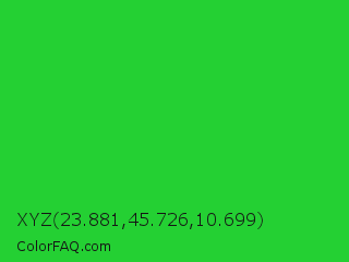 XYZ 23.881,45.726,10.699 Color is a normal green color and the nearest color is Lime Green #32cd32. Hex code #24d033 and RGB value is rgb(36,208,51). In RGB color space, this color is composed of 14% red, 82% green, 20% blue, In CMYK color space, this color is composed of 83% cyan, 0% magenta, 75% yellow , 18% black , In HSL color space, this color has a hue angle of 125° , 70% saturation and 48% lightness.