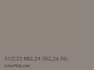 XYZ 23.882,24.502,24.59 Color is a normal orange color and the nearest color is Natural Gray #8b8680. Hex code #8f8682 and RGB value is rgb(143,134,130). In RGB color space, this color is composed of 56% red, 53% green, 51% blue, In CMYK color space, this color is composed of 0% cyan, 6% magenta, 9% yellow , 44% black , In HSL color space, this color has a hue angle of 18° , 5% saturation and 54% lightness.