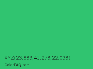 XYZ 23.883,41.278,22.038 Color is a normal green color and the nearest color is UFO Green #3cd070. Hex code #30c470 and RGB value is rgb(48,196,112). In RGB color space, this color is composed of 19% red, 77% green, 44% blue, In CMYK color space, this color is composed of 76% cyan, 0% magenta, 43% yellow , 23% black , In HSL color space, this color has a hue angle of 146° , 61% saturation and 48% lightness.