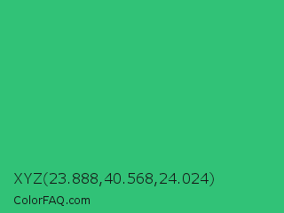 XYZ 23.888,40.568,24.024 Color is a normal green color and the nearest color is UFO Green #3cd070. Hex code #31c277 and RGB value is rgb(49,194,119). In RGB color space, this color is composed of 19% red, 76% green, 47% blue, In CMYK color space, this color is composed of 75% cyan, 0% magenta, 39% yellow , 24% black , In HSL color space, this color has a hue angle of 149° , 60% saturation and 48% lightness.