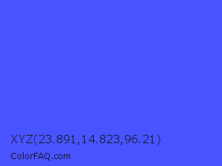 XYZ 23.891,14.823,96.21 Color is a light blue color and the nearest color is Ultramarine Blue #4166f5. Hex code #4953ff and RGB value is rgb(73,83,255). In RGB color space, this color is composed of 29% red, 33% green, 100% blue, In CMYK color space, this color is composed of 71% cyan, 67% magenta, 0% yellow , 0% black , In HSL color space, this color has a hue angle of 237° , 100% saturation and 64% lightness.