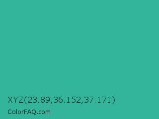 XYZ 23.89,36.152,37.171 Color is a normal cyan color and the nearest color is Keppel #3ab09e. Hex code #33b59c and RGB value is rgb(51,181,156). In RGB color space, this color is composed of 20% red, 71% green, 61% blue, In CMYK color space, this color is composed of 72% cyan, 0% magenta, 14% yellow , 29% black , In HSL color space, this color has a hue angle of 168° , 56% saturation and 45% lightness.