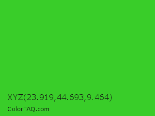 XYZ 23.919,44.693,9.464 Color is a normal green color and the nearest color is Lime Green #32cd32. Hex code #39cd29 and RGB value is rgb(57,205,41). In RGB color space, this color is composed of 22% red, 80% green, 16% blue, In CMYK color space, this color is composed of 72% cyan, 0% magenta, 80% yellow , 20% black , In HSL color space, this color has a hue angle of 114° , 67% saturation and 48% lightness.