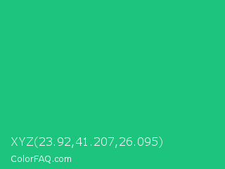 XYZ 23.92,41.207,26.095 Color is a normal green color and the nearest color is Mountain Meadow Crayola #1ab385. Hex code #1cc47d and RGB value is rgb(28,196,125). In RGB color space, this color is composed of 11% red, 77% green, 49% blue, In CMYK color space, this color is composed of 86% cyan, 0% magenta, 36% yellow , 23% black , In HSL color space, this color has a hue angle of 155° , 75% saturation and 44% lightness.