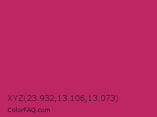 XYZ 23.932,13.106,13.073 Color is a normal rose color and the nearest color is Hibiscus #b6316c. Hex code #bd2663 and RGB value is rgb(189,38,99). In RGB color space, this color is composed of 74% red, 15% green, 39% blue, In CMYK color space, this color is composed of 0% cyan, 80% magenta, 48% yellow , 26% black , In HSL color space, this color has a hue angle of 336° , 67% saturation and 45% lightness.