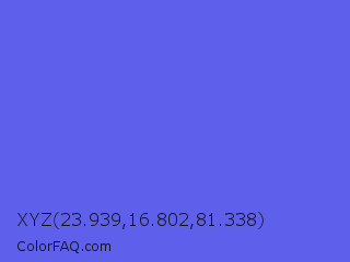 XYZ 23.939,16.802,81.338 Color is a light blue color and the nearest color is Very Light Blue #6666ff. Hex code #5e60ec and RGB value is rgb(94,96,236). In RGB color space, this color is composed of 37% red, 38% green, 93% blue, In CMYK color space, this color is composed of 60% cyan, 59% magenta, 0% yellow , 7% black , In HSL color space, this color has a hue angle of 239° , 79% saturation and 65% lightness.