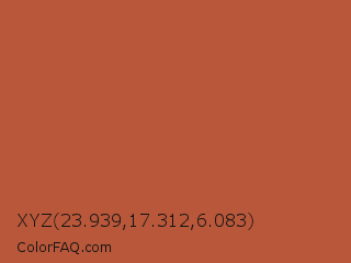 XYZ 23.939,17.312,6.083 Color is a normal red color and the nearest color is Crail #b95140. Hex code #b8573a and RGB value is rgb(184,87,58). In RGB color space, this color is composed of 72% red, 34% green, 23% blue, In CMYK color space, this color is composed of 0% cyan, 53% magenta, 68% yellow , 28% black , In HSL color space, this color has a hue angle of 14° , 52% saturation and 47% lightness.