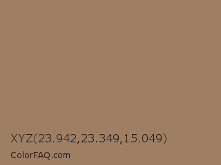 XYZ 23.942,23.349,15.049 Color is a normal orange color and the nearest color is Chamoisee #a0785a. Hex code #9e7f63 and RGB value is rgb(158,127,99). In RGB color space, this color is composed of 62% red, 50% green, 39% blue, In CMYK color space, this color is composed of 0% cyan, 20% magenta, 37% yellow , 38% black , In HSL color space, this color has a hue angle of 28° , 23% saturation and 50% lightness.
