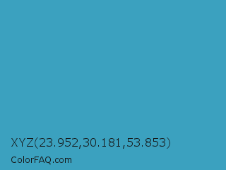 XYZ 23.952,30.181,53.853 Color is a normal blue color and the nearest color is Pelorous #3eabbf. Hex code #3ba1bf and RGB value is rgb(59,161,191). In RGB color space, this color is composed of 23% red, 63% green, 75% blue, In CMYK color space, this color is composed of 69% cyan, 16% magenta, 0% yellow , 25% black , In HSL color space, this color has a hue angle of 194° , 53% saturation and 49% lightness.
