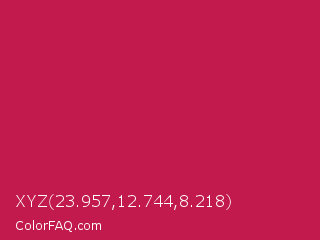 XYZ 23.957,12.744,8.218 Color is a normal rose color and the nearest color is Maroon Flush #c32148. Hex code #c21a4d and RGB value is rgb(194,26,77). In RGB color space, this color is composed of 76% red, 10% green, 30% blue, In CMYK color space, this color is composed of 0% cyan, 87% magenta, 60% yellow , 24% black , In HSL color space, this color has a hue angle of 342° , 76% saturation and 43% lightness.