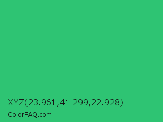 XYZ 23.961,41.299,22.928 Color is a normal green color and the nearest color is UFO Green #3cd070. Hex code #2ec473 and RGB value is rgb(46,196,115). In RGB color space, this color is composed of 18% red, 77% green, 45% blue, In CMYK color space, this color is composed of 77% cyan, 0% magenta, 41% yellow , 23% black , In HSL color space, this color has a hue angle of 148° , 62% saturation and 47% lightness.