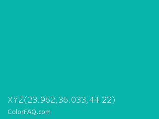 XYZ 23.962,36.033,44.22 Color is a normal cyan color and the nearest color is Tiffany Blue #0abab5. Hex code #07b5ab and RGB value is rgb(7,181,171). In RGB color space, this color is composed of 3% red, 71% green, 67% blue, In CMYK color space, this color is composed of 96% cyan, 0% magenta, 6% yellow , 29% black , In HSL color space, this color has a hue angle of 177° , 93% saturation and 37% lightness.