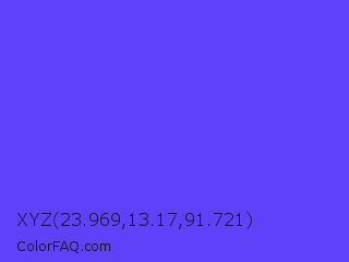 XYZ 23.969,13.17,91.721 Color is a light indigo color and the nearest color is Majorelle Blue #6050dc. Hex code #6041fa and RGB value is rgb(96,65,250). In RGB color space, this color is composed of 38% red, 25% green, 98% blue, In CMYK color space, this color is composed of 62% cyan, 74% magenta, 0% yellow , 2% black , In HSL color space, this color has a hue angle of 250° , 95% saturation and 62% lightness.