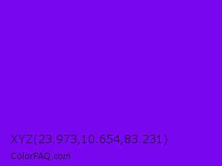 XYZ 23.973,10.654,83.231 Color is a normal violet color and the nearest color is Violet Color Wheel #7f00ff. Hex code #7b07f0 and RGB value is rgb(123,7,240). In RGB color space, this color is composed of 48% red, 3% green, 94% blue, In CMYK color space, this color is composed of 49% cyan, 97% magenta, 0% yellow , 6% black , In HSL color space, this color has a hue angle of 270° , 94% saturation and 48% lightness.