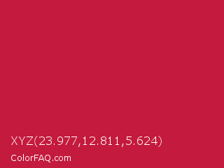 XYZ 23.977,12.811,5.624 Color is a normal red color and the nearest color is Cardinal #c41e3a. Hex code #c41a3d and RGB value is rgb(196,26,61). In RGB color space, this color is composed of 77% red, 10% green, 24% blue, In CMYK color space, this color is composed of 0% cyan, 87% magenta, 69% yellow , 23% black , In HSL color space, this color has a hue angle of 348° , 77% saturation and 44% lightness.