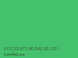 XYZ 23.977,40.042,20.101 Color is a normal green color and the nearest color is Medium Sea Green #3cb371. Hex code #46c06a and RGB value is rgb(70,192,106). In RGB color space, this color is composed of 27% red, 75% green, 42% blue, In CMYK color space, this color is composed of 64% cyan, 0% magenta, 45% yellow , 25% black , In HSL color space, this color has a hue angle of 138° , 49% saturation and 51% lightness.