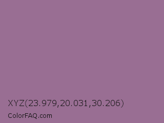 XYZ 23.979,20.031,30.206 Color is a normal magenta color and the nearest color is Mountbatten Pink #997a8d. Hex code #996e93 and RGB value is rgb(153,110,147). In RGB color space, this color is composed of 60% red, 43% green, 58% blue, In CMYK color space, this color is composed of 0% cyan, 28% magenta, 4% yellow , 40% black , In HSL color space, this color has a hue angle of 308° , 17% saturation and 52% lightness.