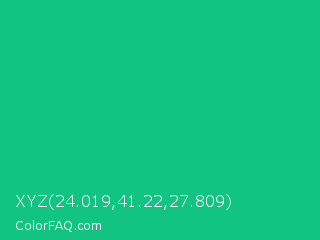 XYZ 24.019,41.22,27.809 Color is a normal green color and the nearest color is Mountain Meadow Crayola #1ab385. Hex code #12c482 and RGB value is rgb(18,196,130). In RGB color space, this color is composed of 7% red, 77% green, 51% blue, In CMYK color space, this color is composed of 91% cyan, 0% magenta, 34% yellow , 23% black , In HSL color space, this color has a hue angle of 158° , 83% saturation and 42% lightness.