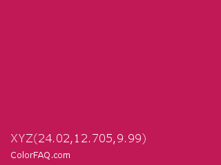 XYZ 24.02,12.705,9.99 Color is a normal rose color and the nearest color is Rose Red #c21e56. Hex code #c11956 and RGB value is rgb(193,25,86). In RGB color space, this color is composed of 76% red, 10% green, 34% blue, In CMYK color space, this color is composed of 0% cyan, 87% magenta, 55% yellow , 24% black , In HSL color space, this color has a hue angle of 338° , 77% saturation and 43% lightness.