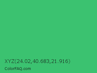 XYZ 24.02,40.683,21.916 Color is a normal green color and the nearest color is UFO Green #3cd070. Hex code #3bc270 and RGB value is rgb(59,194,112). In RGB color space, this color is composed of 23% red, 76% green, 44% blue, In CMYK color space, this color is composed of 70% cyan, 0% magenta, 42% yellow , 24% black , In HSL color space, this color has a hue angle of 144° , 53% saturation and 50% lightness.