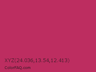 XYZ 24.036,13.54,12.413 Color is a normal rose color and the nearest color is Rich Maroon #b03060. Hex code #bd2d60 and RGB value is rgb(189,45,96). In RGB color space, this color is composed of 74% red, 18% green, 38% blue, In CMYK color space, this color is composed of 0% cyan, 76% magenta, 49% yellow , 26% black , In HSL color space, this color has a hue angle of 339° , 62% saturation and 46% lightness.